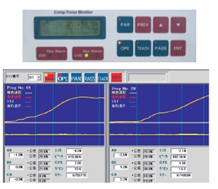 端子圧着に対しては、クリンプフォースモニターによる端子圧着時の圧力検出を全数実施し、不良発生時の圧力変化を捕らえ不良検出を行います。